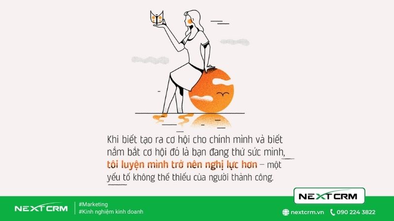 Mỗi lần tự tạo ra cơ hội cho chính mình là một lần bạn đang thách thức giới hạn của bản thân. Đó là cách bạn trưởng thành, mạnh mẽ và tự tin hơn. Khi biết tạo ra cơ hội cho chính mình và biết nắm bắt cơ hội đó là bạn đang thử sức mình, tôi luyện mình trở nên nghị lực hơn – một yếu tố không thể thiếu của người thành công.